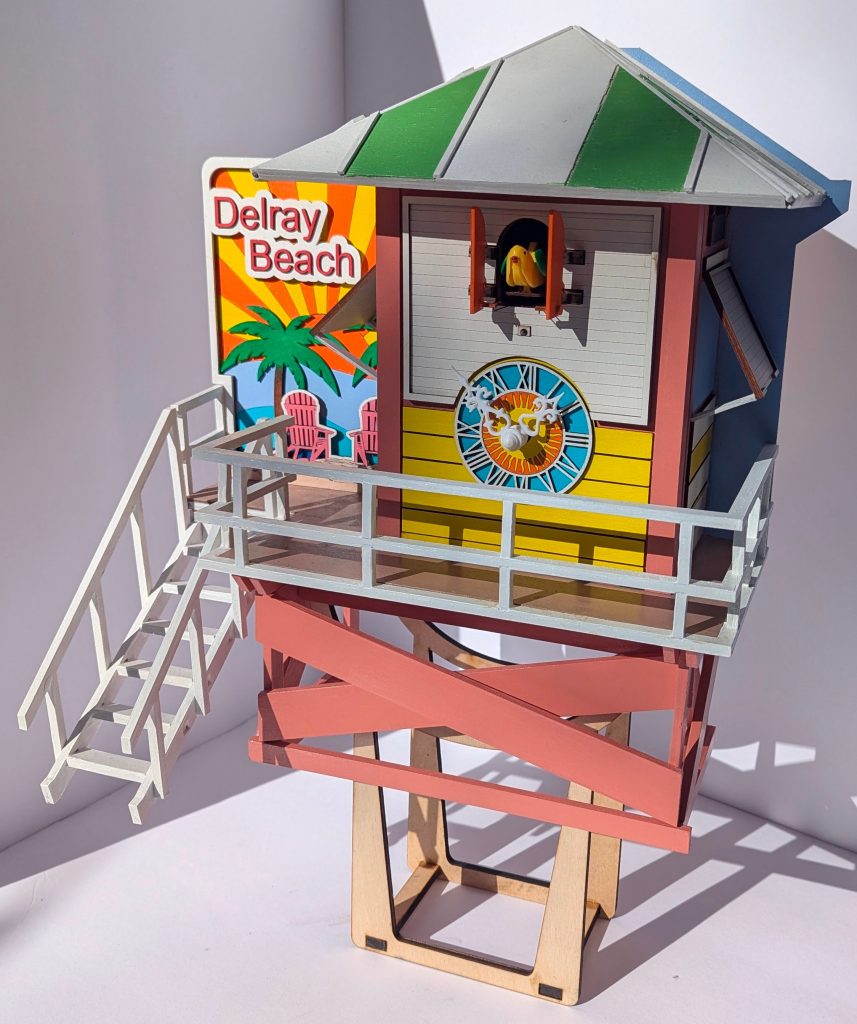 I started looking for shapes in my daily life in Delray Beach that echoed the structure of a cuckoo clock house. I realized that the iconic Lifeguard Stand is the perfect coastal parallel. It is a small, elevated structure. It watches over the rhythm of the day. It is architectural, yet whimsical.